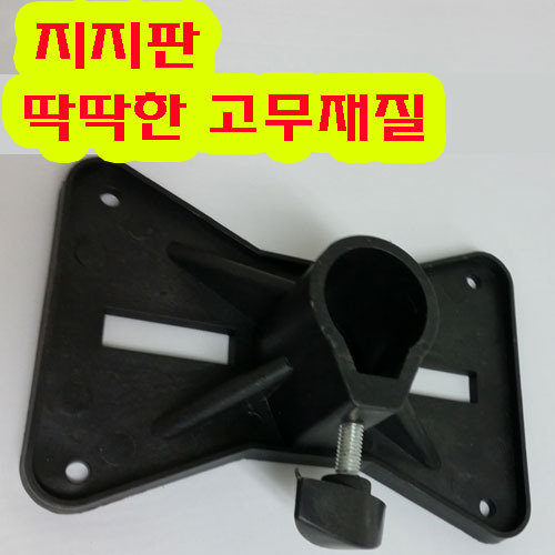 딱딱한 고무재질의 폴대 지지판입니다. 폴대사이즈 조절레버가 있어 35파이 이하의 지지봉을 고정시킬 수 있습니다. 바닥판의 4곳의 홀사이즈는 6.2~6.5mm (M6 앙카볼트로 고정가능)입니다. (폴대는 배송되지 않습니다.)